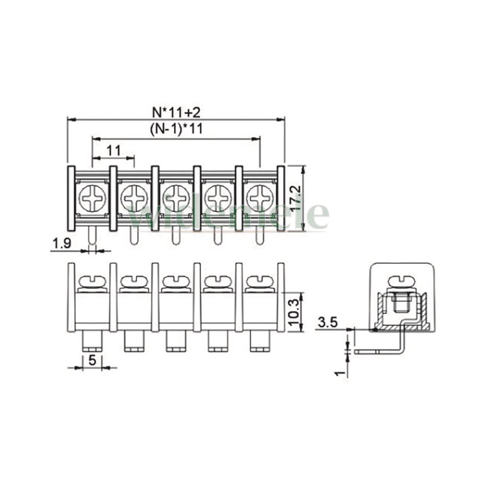 | Description: | PCB Barrier Terminal Blocks, with clear wiring, can connect all types of wires with a cross-sectional area of 0.5mm ² to 70mm ², with a spacing pitch of 6.35-27mm to choose, and can be provided with covered or uncovered styles. The product design complies with international standards such as UL1059 and IEC60947. The commonly used spacing pitch is 6.35 7.62 8.25 9.5mm. The color is usually black. | PIN distance: 6.35 7.62 8.25 9.5mm (02-09P) | Rated voltage/current UL: 300V/30A | Rated voltage/current IEC: 600V/32A | Voltage endurance: AC2500V/Min | Wire diameter: 22-12AWG 0.5-4mm ² | Temperature range: -40 ℃ -+105 ℃ | Tin adhesion: 260+/-5 ℃ | Torque: M4 12.24kgf.cm/1.2N.m/10.53Lb. in | Plastic parts: PA66, flame retardant: V-0 | Cover plate: PC | Plastic color: Black | Screw (steel/nickel plated) | Solder legs: brass plated with tin |